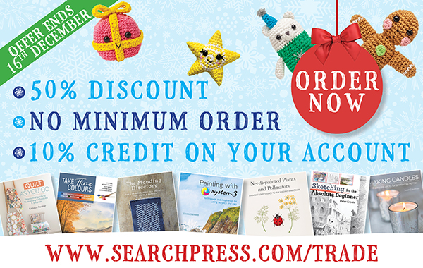 And to show our appreciation, one lucky customer will be chosen at random to receive their order FREE of charge!Place your order through our website, entering code TOPSXMAS21 in the promotion code box at checkout. You can also order by emailing us or through your local representativeTo order or for details of our full range, please visit our trade website. If you have a trade account with us then just enter your login details and start ordering.Please note, Search Press customer services and warehouse will be closed from 25th December 2021, reopening on Tuesday 4th January 2022.Any problems, don’t hesitate to call our customer services on 01892 510850 or email usTerms and conditions:*50% discount applies to full priced books and products on the Search Press website, excluding software. A 10% credit on the value of this top-up order will be applied to your account before the end of December 2021 and can be offset against any outstanding invoice. If your account is set up to receive backorders, the extra discount will not be applied to those titles supplied separately- please only order books for this promotion that are in stock. No minimum order but standard postage charges apply, for more details see full T&Cs on our website here. To take advantage of this special discount, please make sure to use the reference code TOPSXMAS21 when placing the order. This special discount will replace your usual terms and cannot be used in conjunction with any other offers. If you include promotional books with your order no discount will be applied on top of these books. Offer is available until 16th December 2021, while stocks last and excludes direct dispatch accounts. Deliveries before Christmas applies to UK customers only. One lucky customer will be chosen at random to receive a credit against the full value of their top-up order invoice and will be notified before December 24th. There is no cash alternative to this prize.